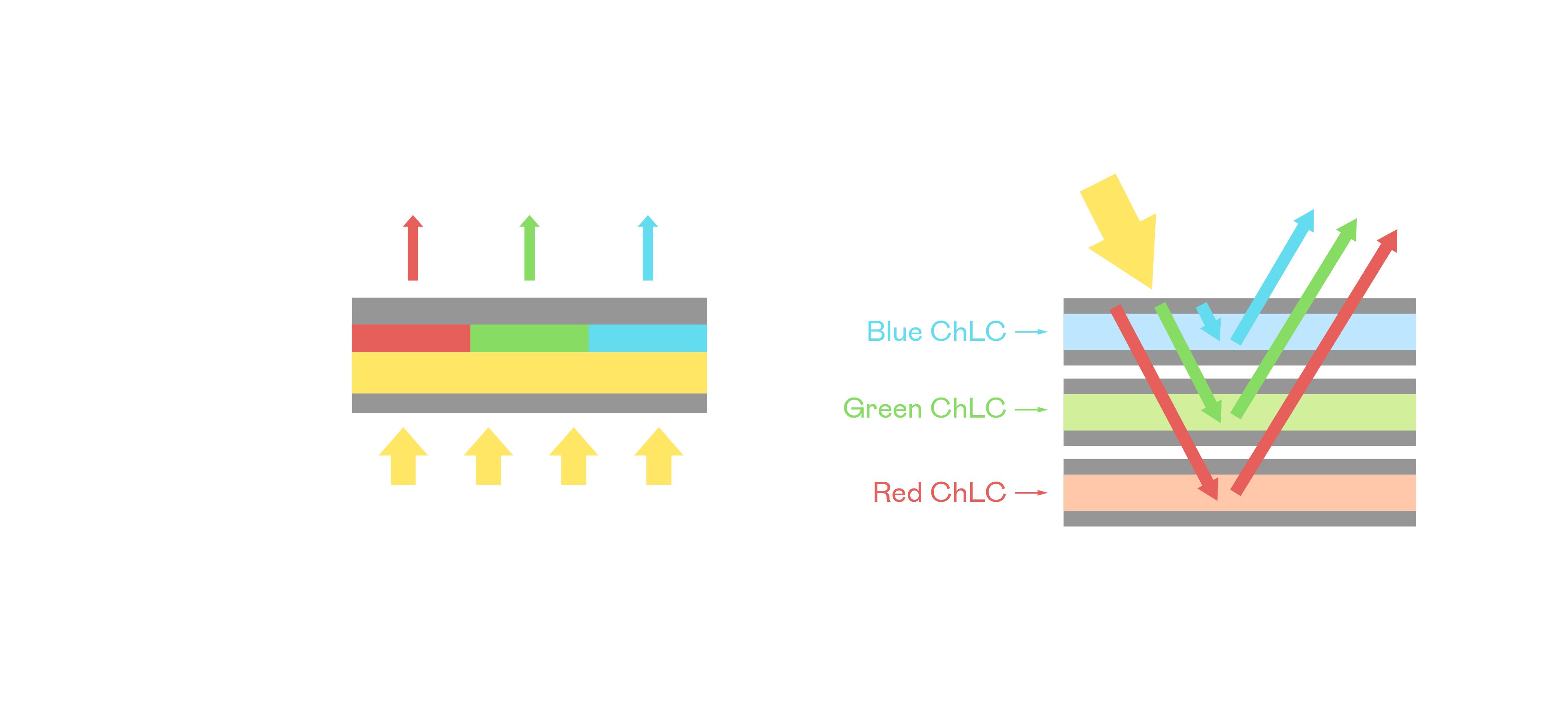 beat365胆固醇液晶显示器是由红、绿、蓝三层胆固醇液晶面板堆叠而成,并采用无彩色滤光片设计,减少环境光在反射过程中的损耗。