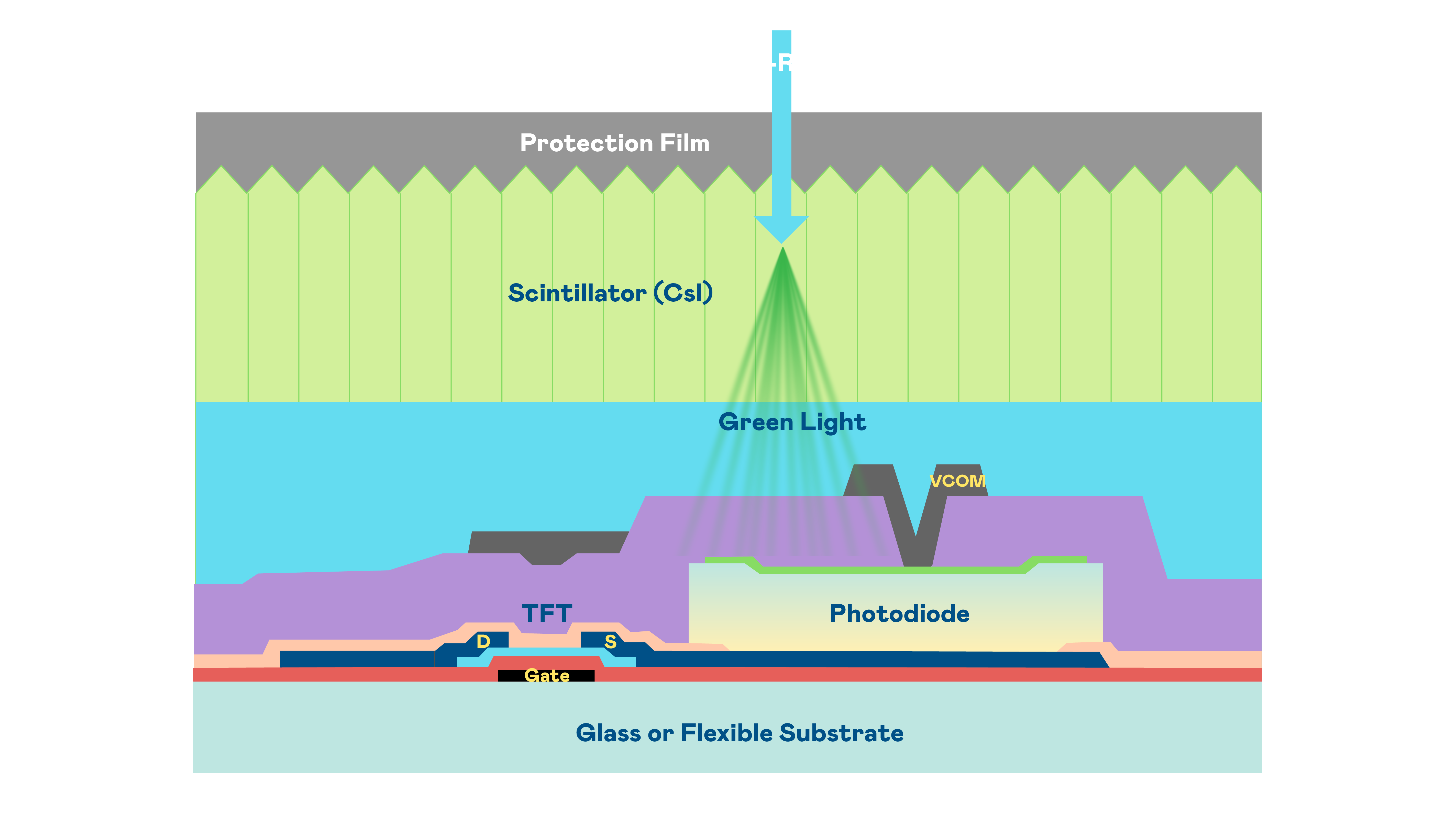 beat365的X光影像感测阵列使用薄膜电晶体 (TFT) 作为每个像素的读取开关,搭配光电二极体(Photodiode)的光电转换元件,用以感测X光影像讯号。